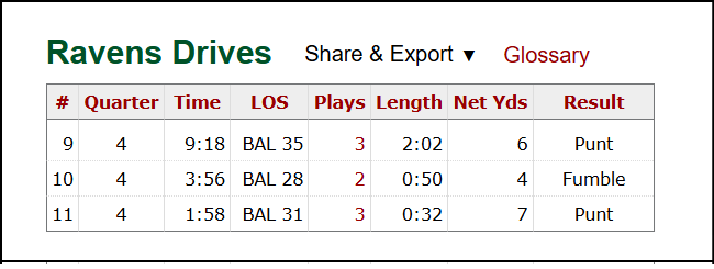 In this case, the Bills punted with about 9:30 to play, and over their next three drives the Ravens did this: