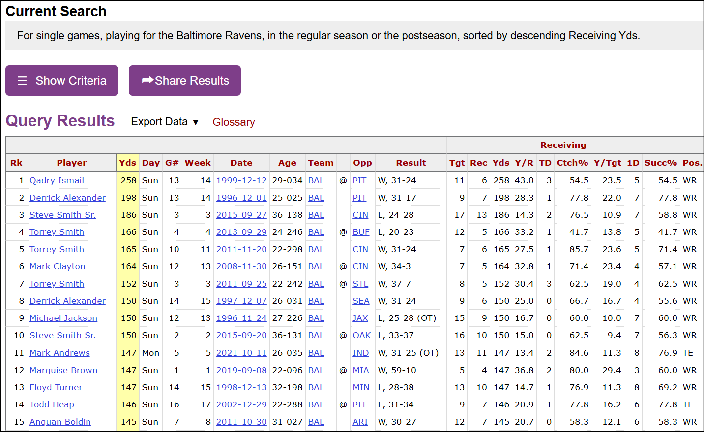 One of the most dominant games for a Ravens receiver I can remember. It does NOT crack the top ten Ravens games for receiving yardage. We think of the Ravens as being perennially shortchanged in receiving talent, but their single-game leaderboard is actually very respectable. Qadry Ismail had a game in 1999 of over 250 yards, Derrick Alexander had almost 200 one time and 150 another; Steve Smith went for 180 and 150; Torrey Smith went for 160+ twice and 150 another time; Todd Heap and Marqiuse Brown and Mark Andrews have all had games near 150.