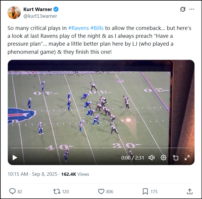 This used up the last of the Bills timeouts. A first down ends the game. A punt – well, up know what a punt does. But let’s look at this play again, thru the eyes of Hall Of Fame (and Super Bowl -winning) QB Kurt Warner:
