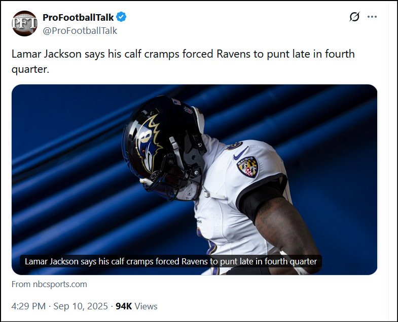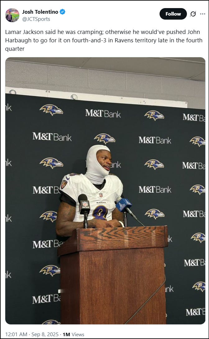 I don’t prefer that to having Lamar on the field for 4th down: not in a million years. But I strongly prefer it to having the choice of going to it taken away. “Ah well, Lamar’s got a cramp, I guess we’re fucked.” No.