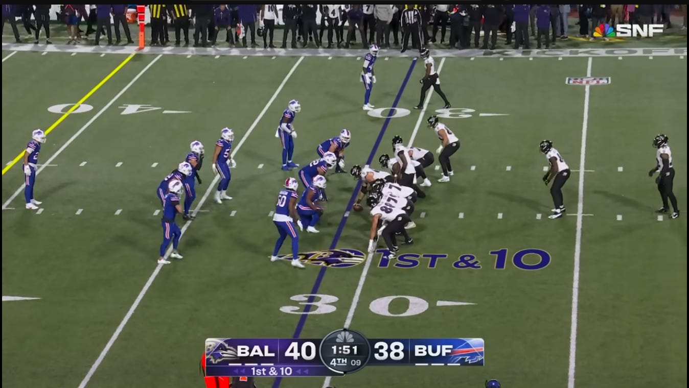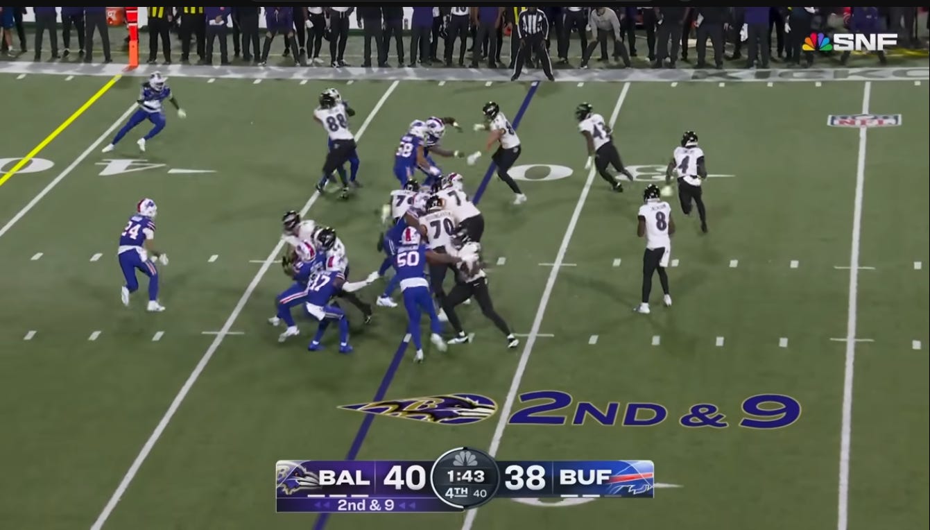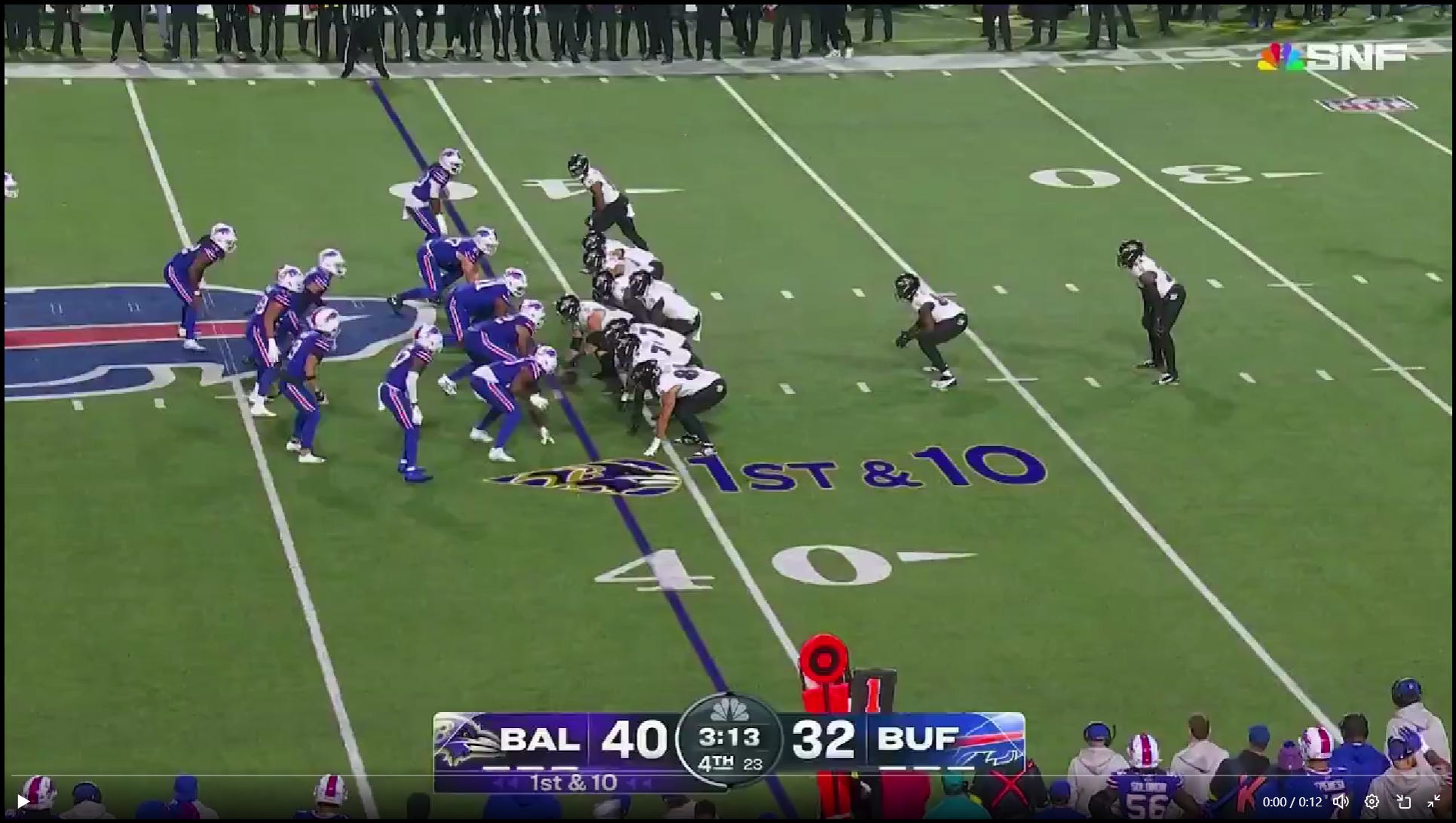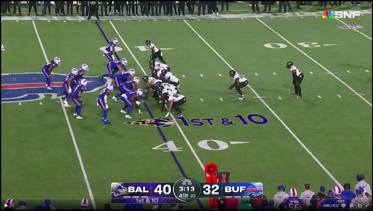 The Ravens have Lamar Jackson. The Bills must attack the line with the I-formation and 6-man OL and the damage Henry has already done. To me it makes sense to send Lamar to the line with an option: if he sees this shit, abort the handoff and roll out. There’s that WR on the offensive right side; and if Lamar doesn’t like it, he can just pick up 5 and slide.