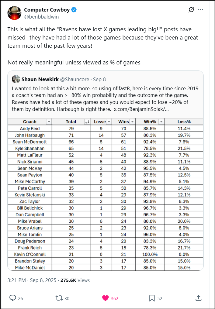 The pic that Baldwin is quote-tweeting is a list of every time since 2019 a coach's team had an >=80% win probability. Here’s that pic blown up: check out the highlighted numbers: