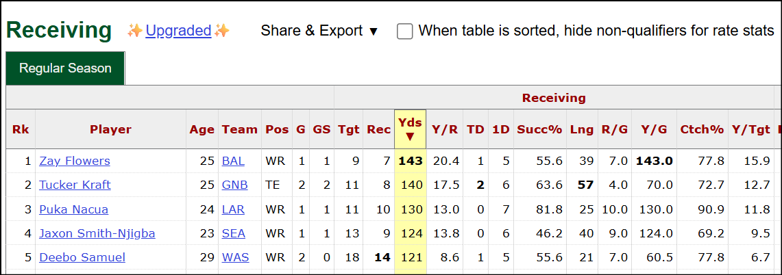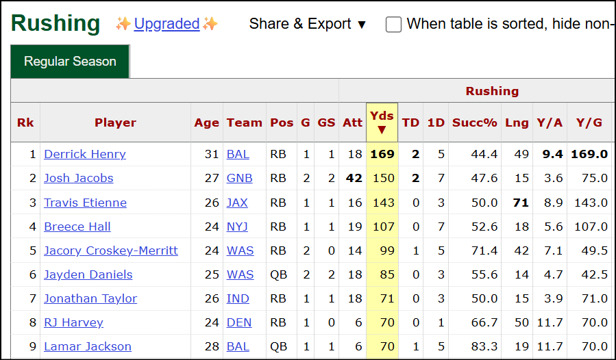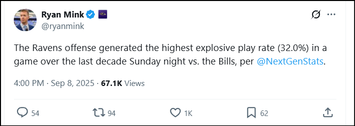Or hell, maybe it will. After all Lamar led the lead in those stats last year. Derrick Henry was only 84 yards off the league lead. And if Zay Flowers is going to continue posting 4 explosive plays per game, they might as well keep feeding him.