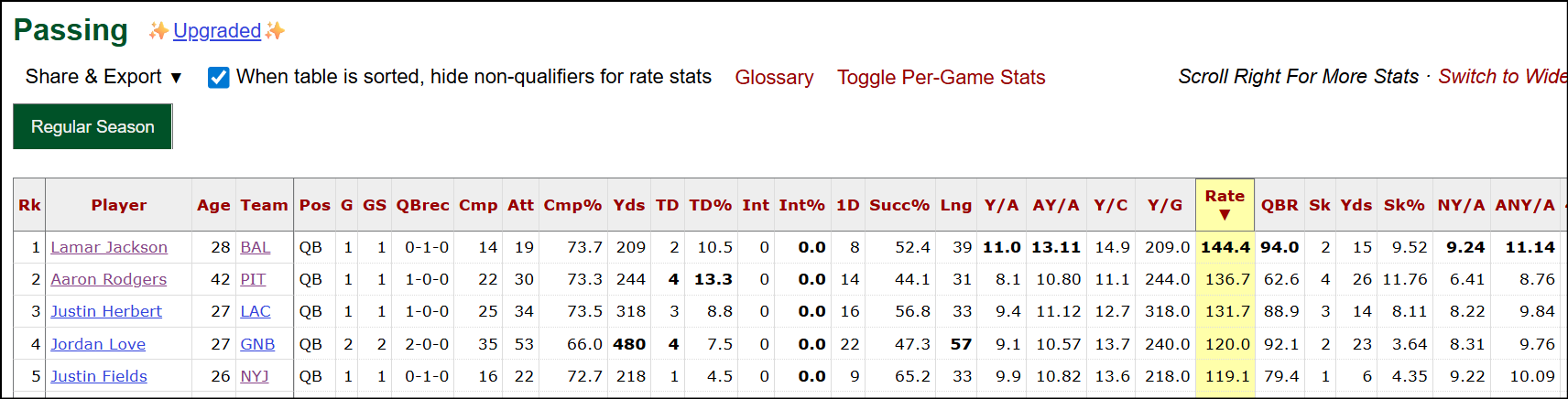 Your Ravens have the NFL’s leading receiver, the leading rusher, and the leading passer by rating (and Yds-per-att, and Net-yds-per-att):