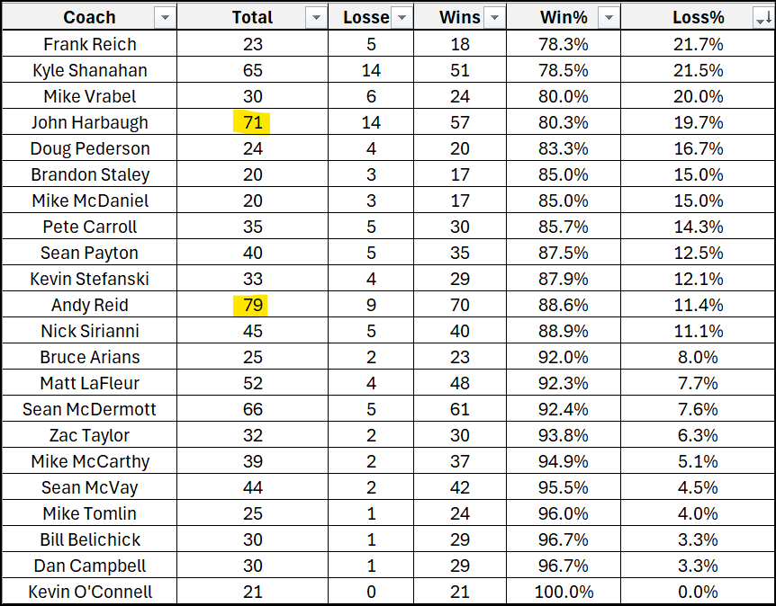 Only Andy Reid (and Patrick Mahomes) have created more such “winning opportunities” since the start of 2019. This is what we want to fire Harbaugh for?? Like, would Harbaugh be a better coach if he had lost some of these games without ever building a lead? I don’t think so.