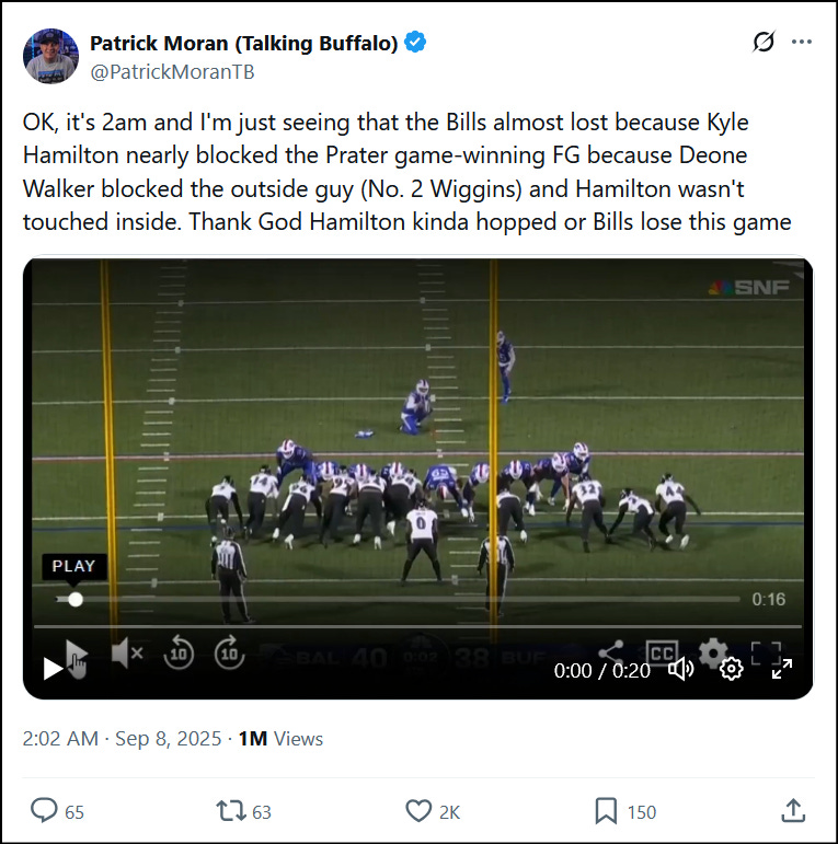 There’s another way to read all that. The Ravens went on the road against the presumptive stongest team in the AFC, and the Bills needed all of that to go their way to snatch the win.